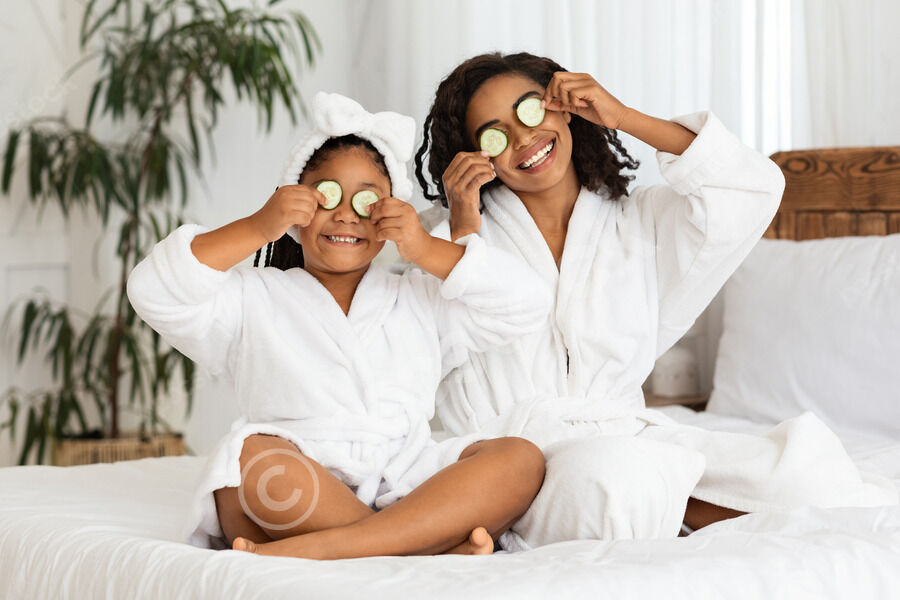 Smiling Black mother and daughter in bathrobes holding cucumber slices while sitting together on bed at home