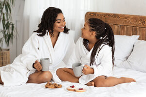 Cheerful Black mother and daughter in bathrobes talking with each other while sitting together on bed with breakfast at home
