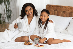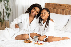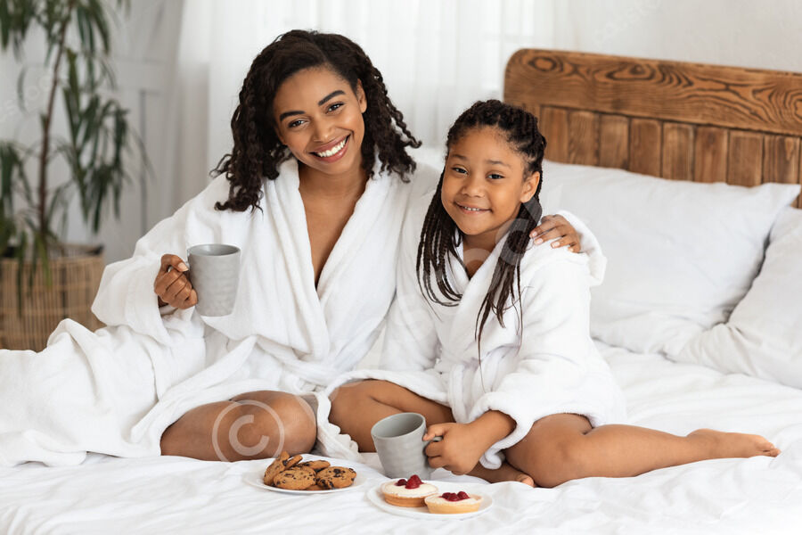 Cheerful Black mother and daughter in bathrobes sitting together on bed with breakfast at home