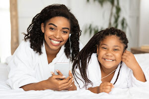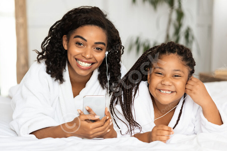 Smiling Black mother and daughter in bathrobes listening to music on earphones while lying together with smartphone on bed at home