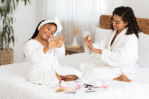 Smiling Black mother in bathrobe applying nail polish to her daughter while sitting together on bed at home