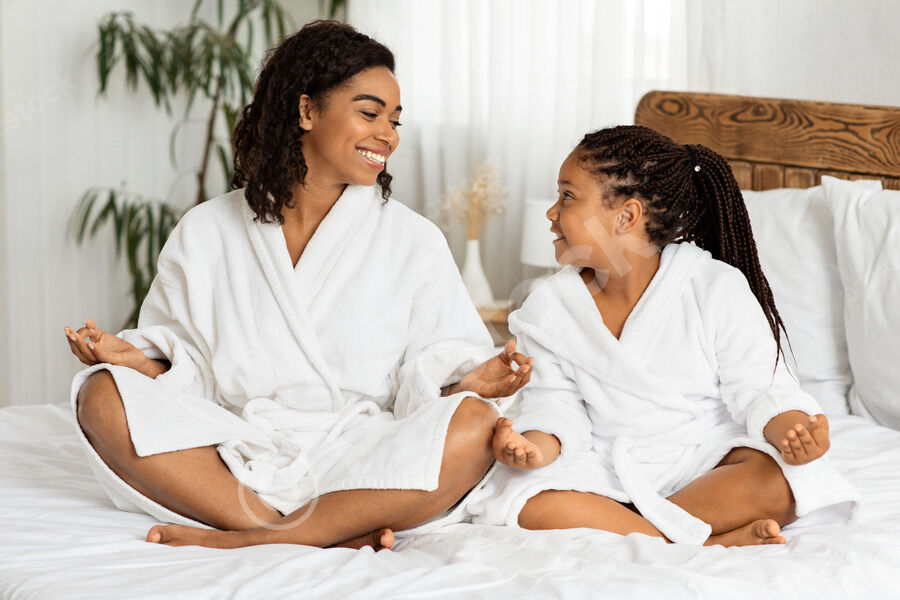 Smiling Black mother and daughter in bathrobes meditating in lotus position on bed at home