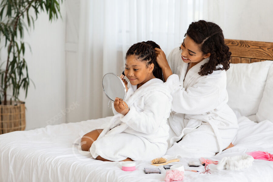 Smiling Black daughter in bathrobe looking at mirror applying blush with her mother doing her hair while sitting together on bed at home