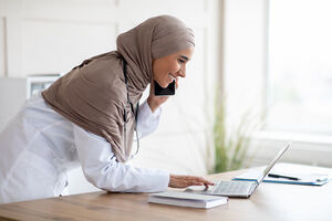 Middle Eastern female doctor wearing hijab and stethoscope around her neck having phone call and using laptop while standing and leaning forward on table in clinic