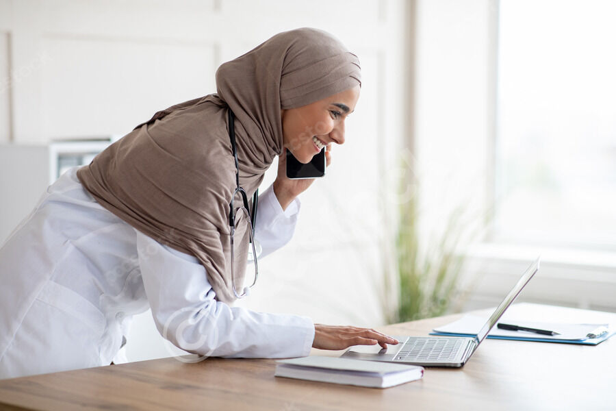 Middle Eastern female doctor wearing hijab and stethoscope around her neck talking on mobile phone and looking at laptop screen while sitting at table in clinic
