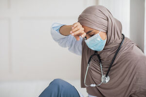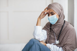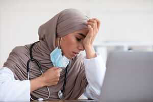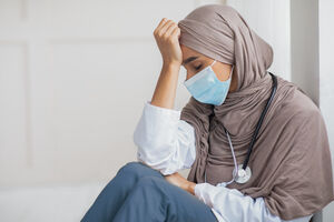 Exhausted Middle Eastern female doctor wearing hijab, face mask, and stethoscope around her neck leaning head on her hands while crouching in clinic