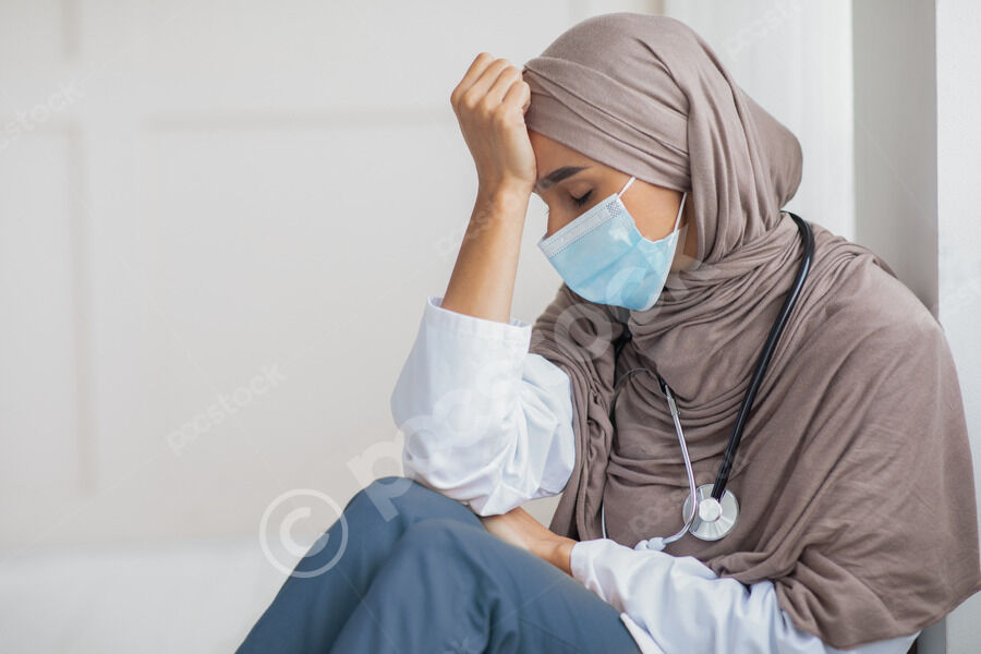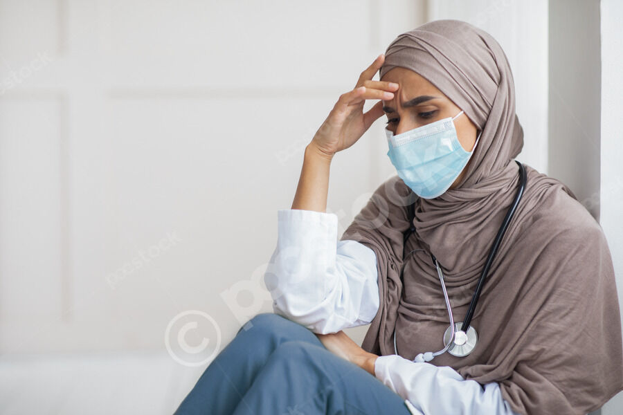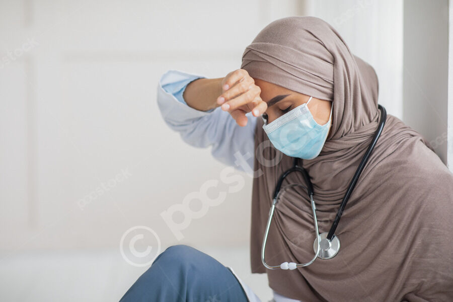 Exhausted Middle Eastern female doctor wearing hijab and face mask touching her forehead while sitting on floor in clinic