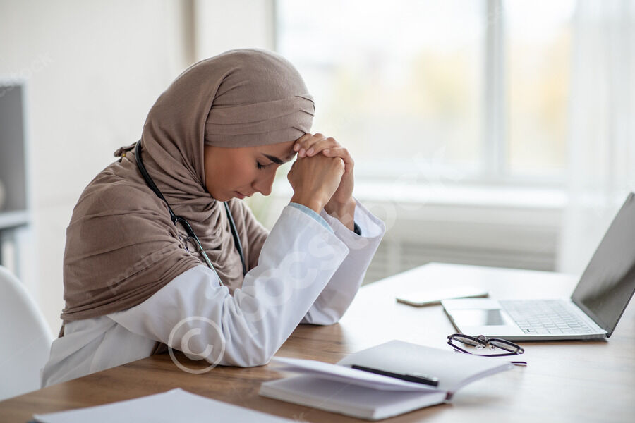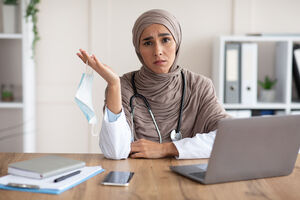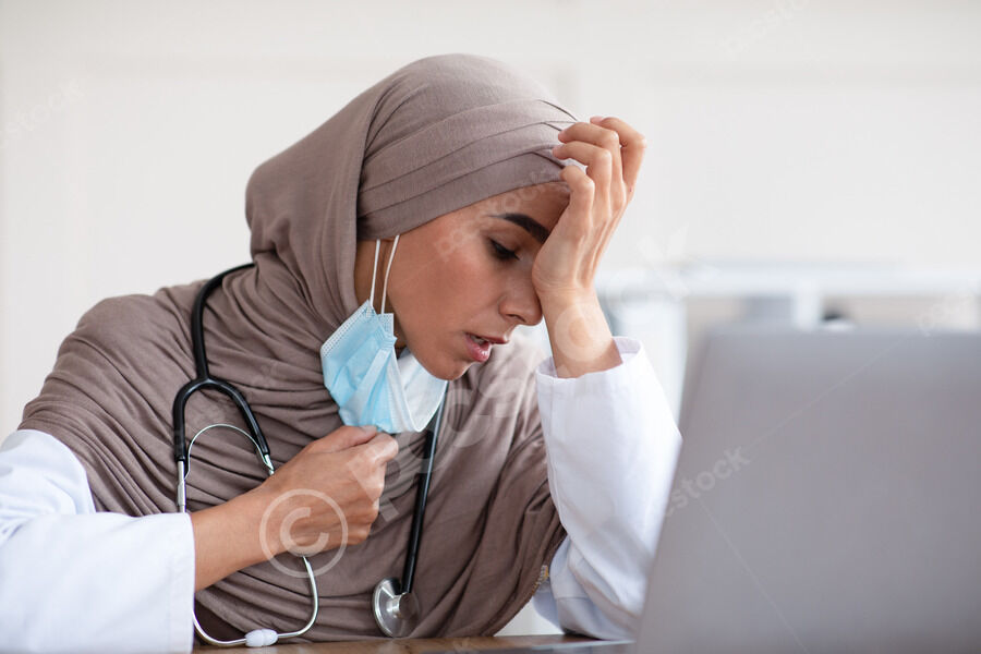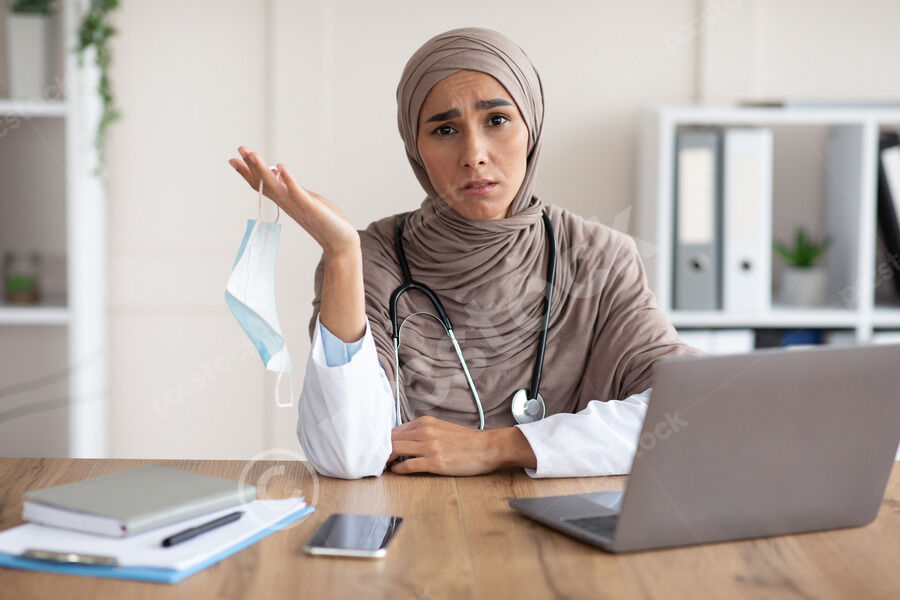 Middle Eastern female doctor wearing hijab removing her face mask and leaning her face on her hand while sitting at table with laptop in clinic