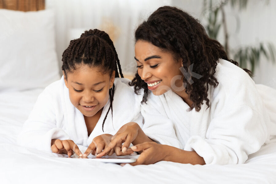 Black mother and daughter in bathrobes using tablet while lying together on bed at home