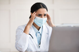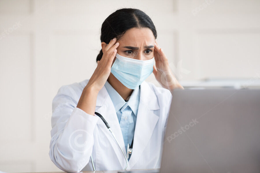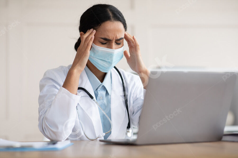Middle Eastern female doctor wearing face mask massaging her temples suffering headache and looking at laptop screen while sitting at table in clinic