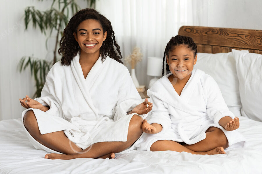 Smiling Black mother and daughter in bathrobes meditating in lotus position on bed at home