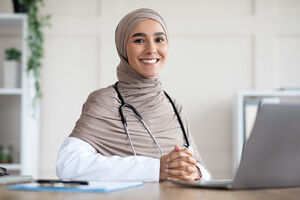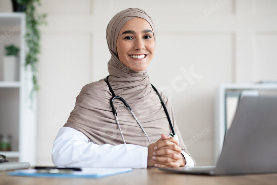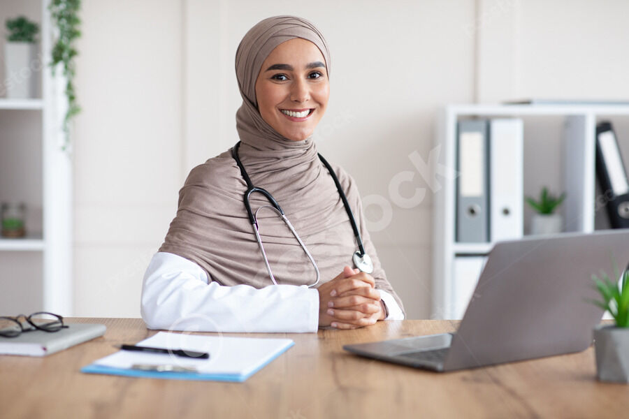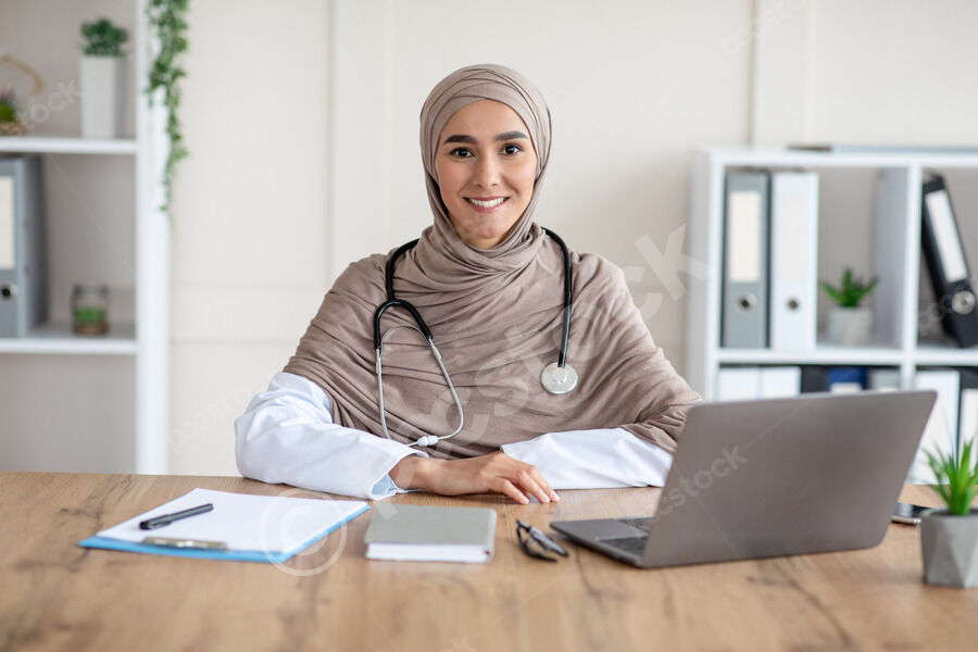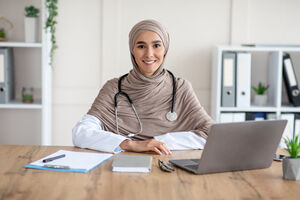 Middle Eastern female doctor wearing hijab and stethoscope around her neck sitting at table with laptop and medical chart in clinic