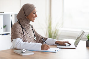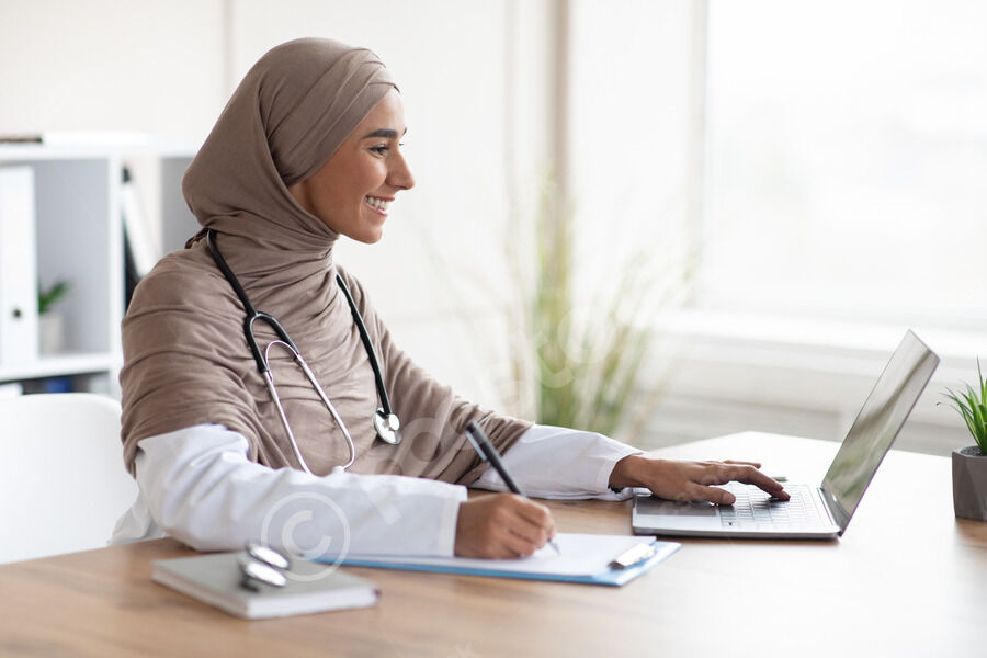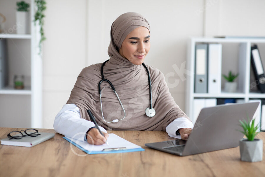 Middle Eastern female doctor in hijab using laptop and taking notes sitting at table in clinic