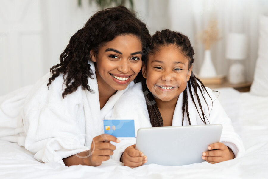 Cheerful Black mother and daughter in bathrobes paying online with credit card on tablet while lying together on bed at home