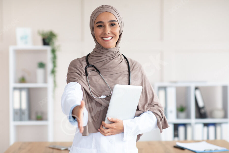 Middle Eastern female doctor wearing hijab and stethoscope around her neck holding tablet and offering handshake while standing in front of her work table in clinic