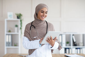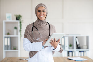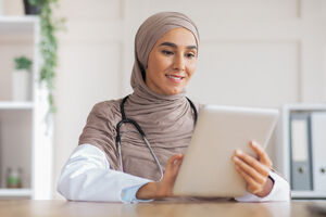 Middle Eastern female doctor wearing hijab and stethoscope around her neck using tablet while sitting at table in clinic