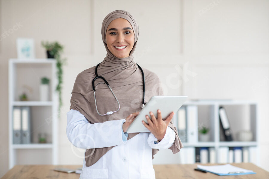 Middle Eastern female doctor wearing hijab and stethoscope around her neck holding tablet and smiling while standing in front of her work table in clinic