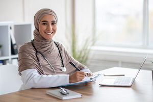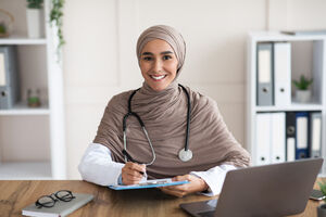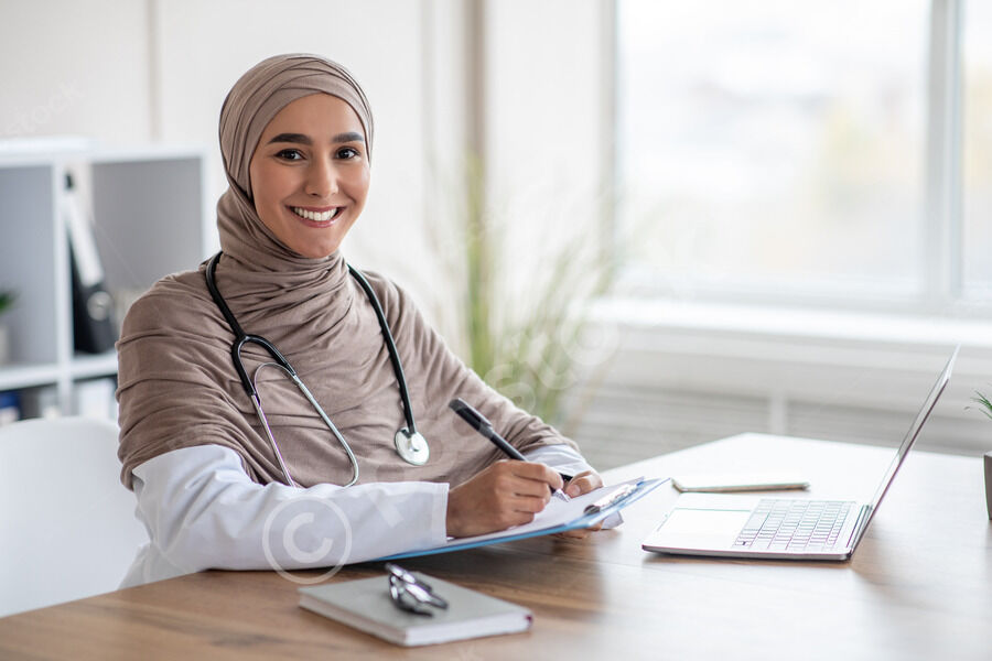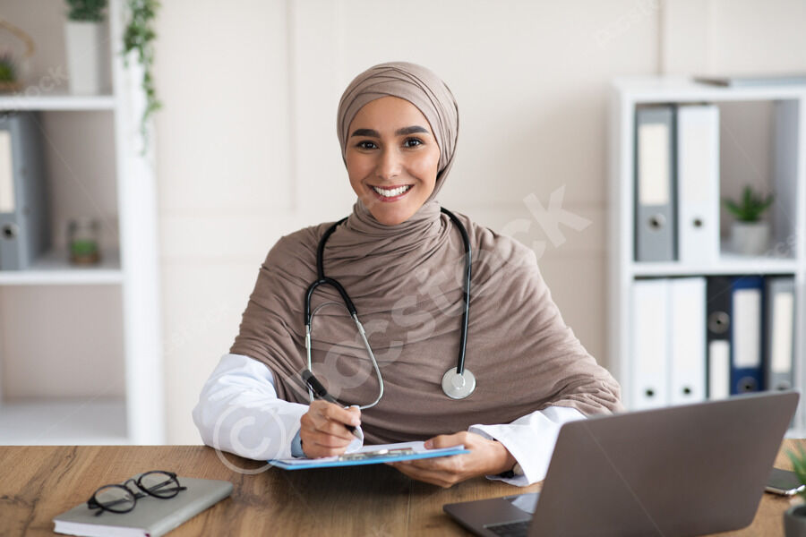 Smiling Middle Eastern female doctor with stethoscope aound her neck wearing hijab writing on medical chart sitting at table with laptop in clinic