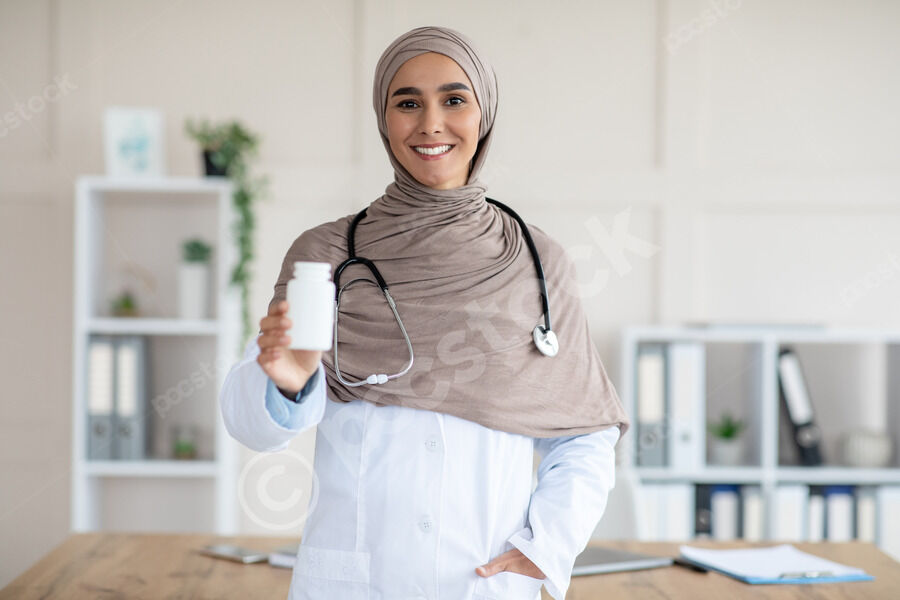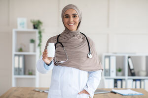 Middle Eastern female doctor wearing hijab and stethoscope around her neck holding medicine bottle while standing in front of her work table in clinic