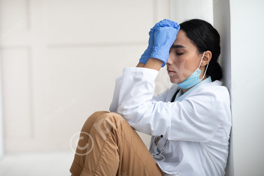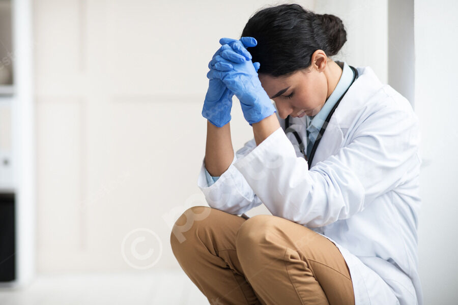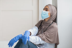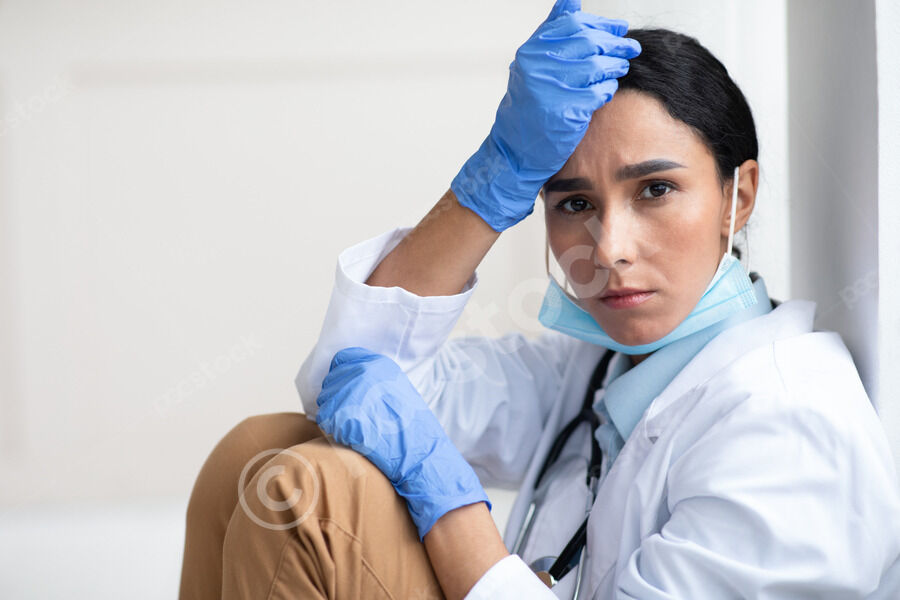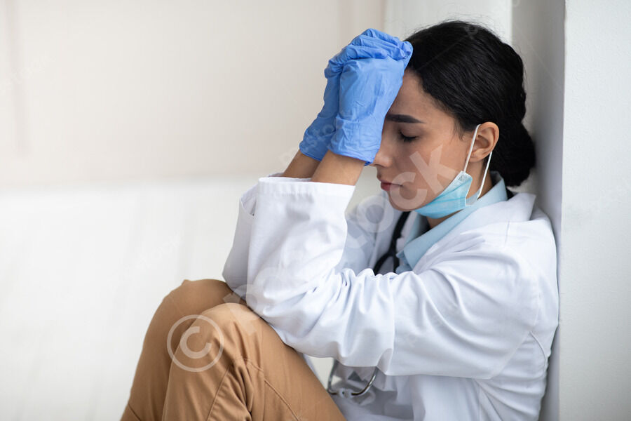 Middle Eastern female doctor wearing surgical gloves and face mask leaning head on her hand sitting on floor in clinic