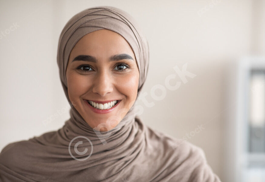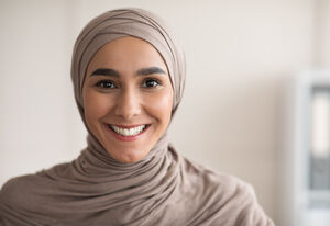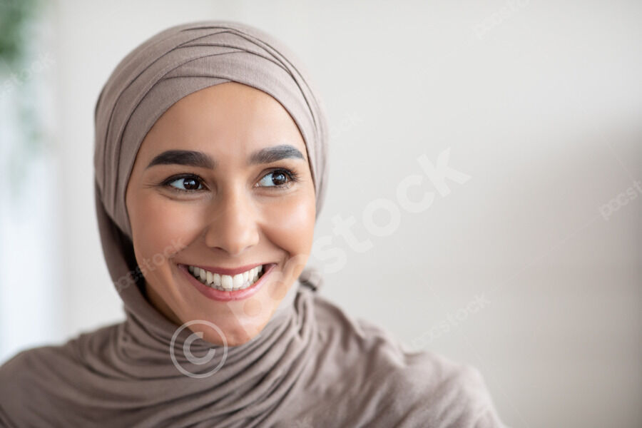 Middle Eastern woman wearing hijab smiling and looking away while standing indoors