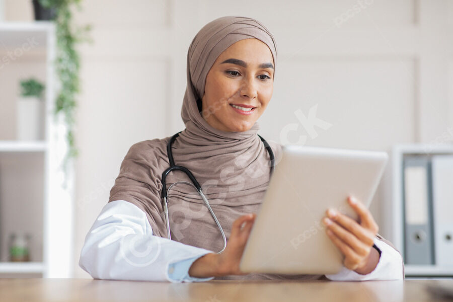 Middle Eastern female doctor in hijab with stethoscope around her neck using tablet making online appointment sitting at table in clinic