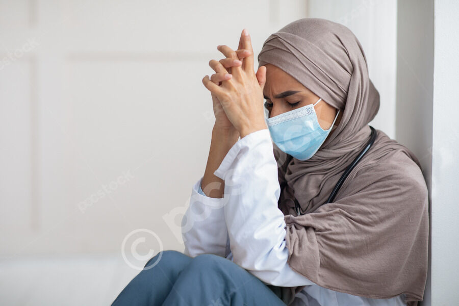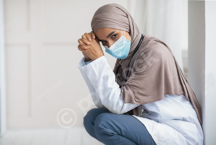 Exhausted Middle Eastern female doctor wearing hijab and face mask sitting with clasped hands and closed eyes on floor in clinic