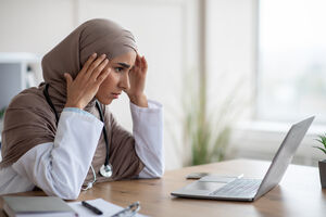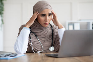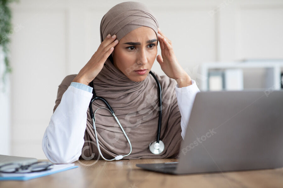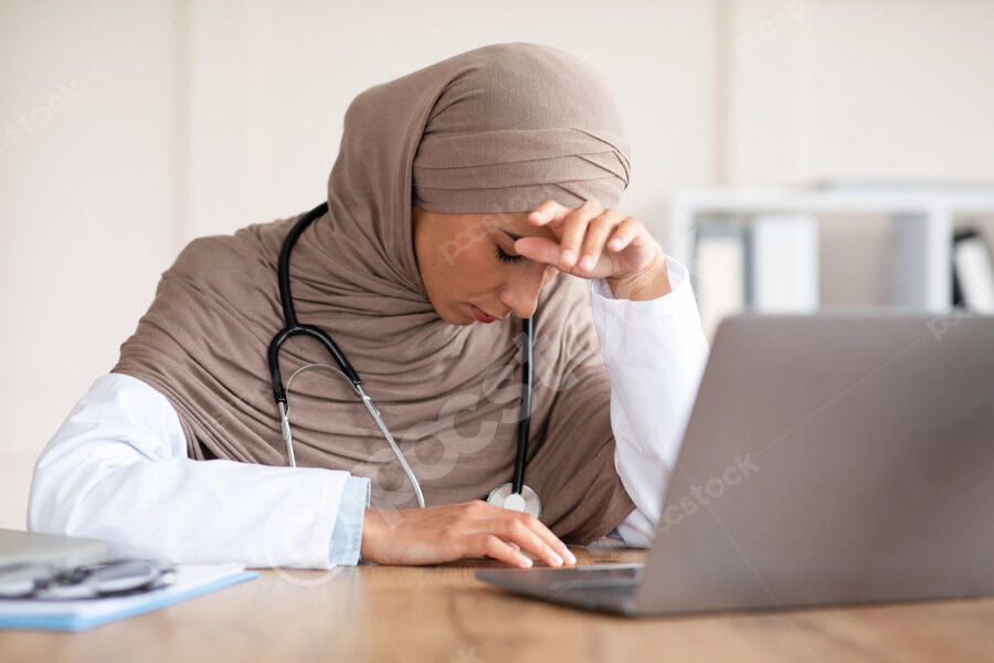 Exhausted Middle Eastern female doctor wearing hijab and stethoscope around her neck touching her temples and looking at laptop screen while sitting at table in clinic