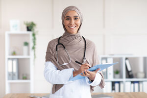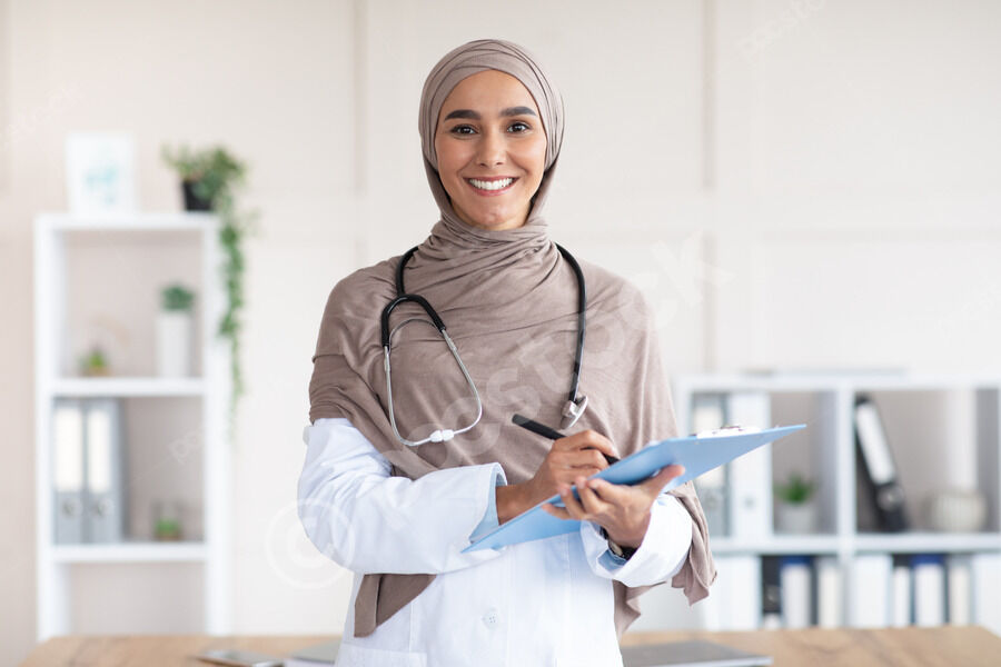 Middle Eastern female doctor wearing hijab and stethoscope around her neck holding clipboard and smiling while standing in front of her work table in clinic