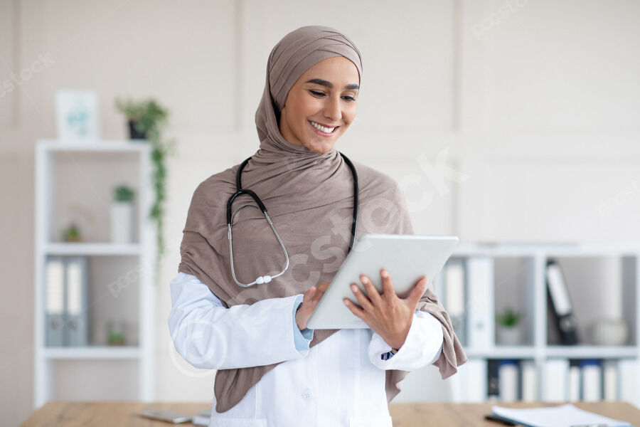 Cropped image of Middle Eastern female doctor wearing hijab and stethoscope around her neck using tablet while sitting at table in clinic