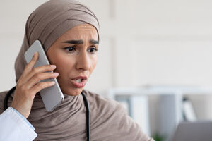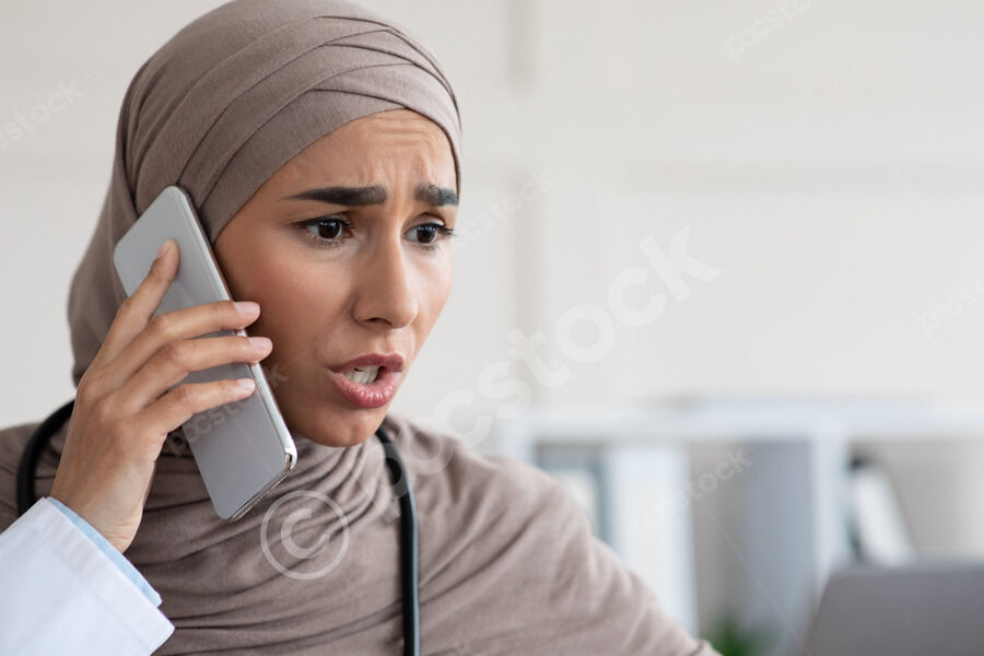Worried Middle Eastern female doctor wearing hijab and stethoscope around her neck talking on mobile phone and looking away while sitting at table in clinic