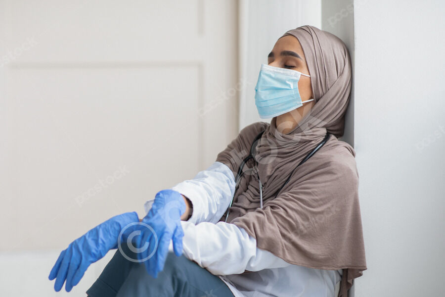 Tired Middle Eastern female doctor wearing hijab, stethoscope around her neck, face mask, and surgical gloves sitting with closed eyes on floor in clinic