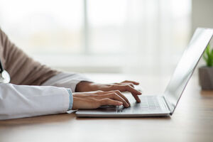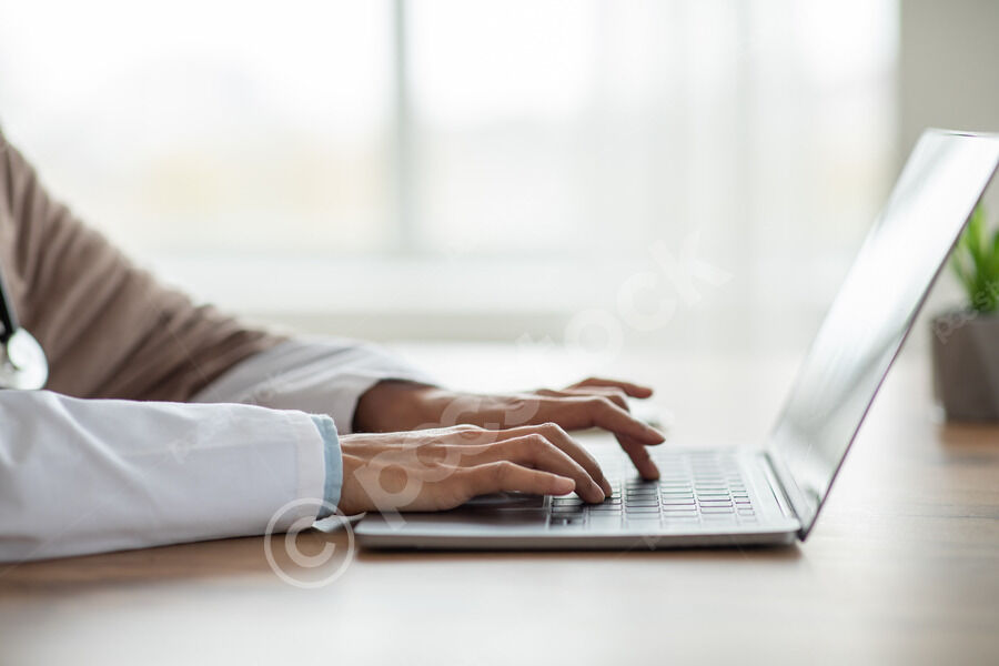 Cropped image of Middle Eastern female doctor working on laptop while sitting at table in clinic
