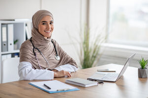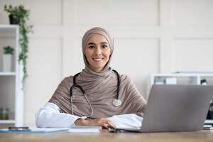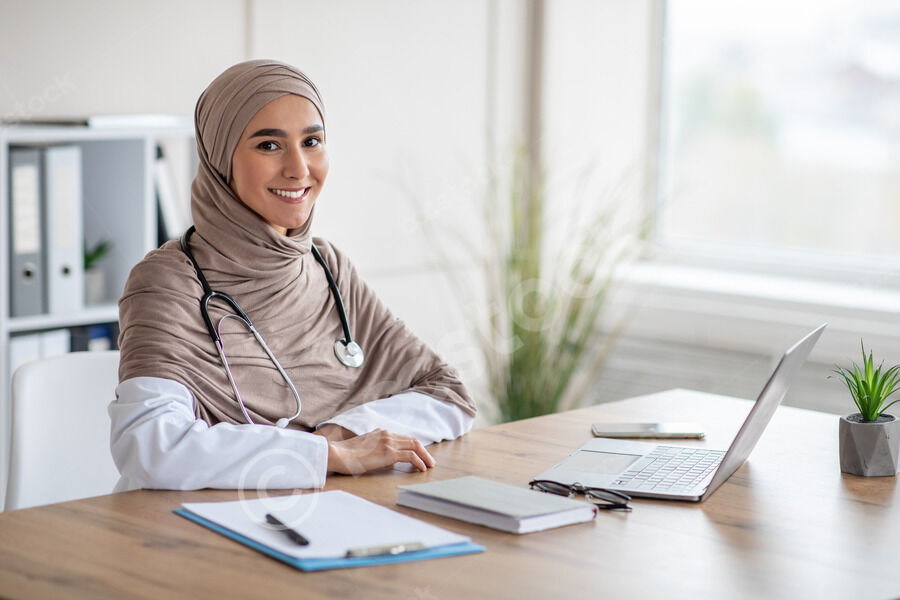 Middle Eastern female doctor wearing hijab and stethoscope around her neck sitting at table with laptop and medical chart in clinic