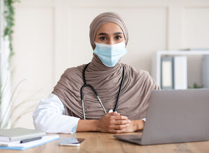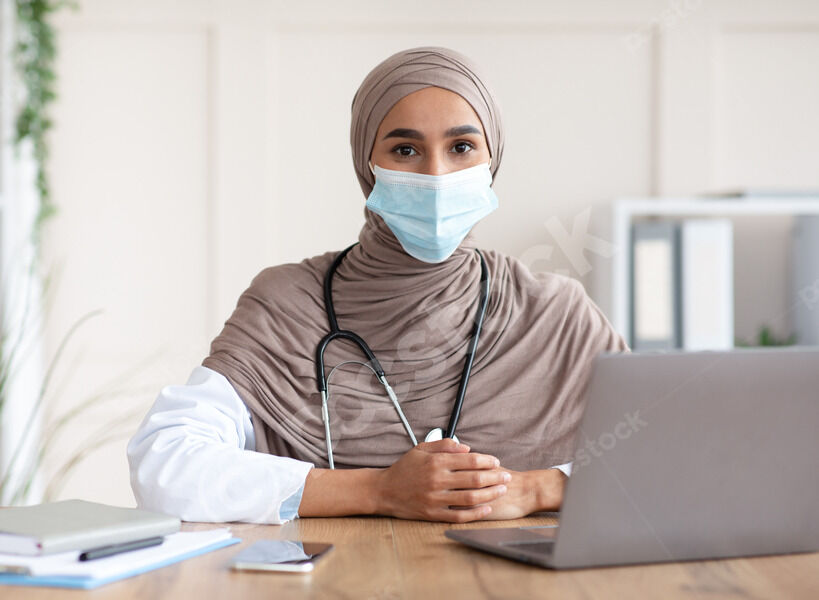 Middle Eastern female doctor wearing hijab, face mask, and stethoscope around her neck sitting at table with laptop in clinic