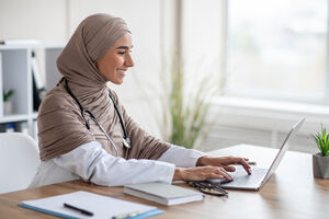 Middle Eastern female doctor wearing hijab and stethoscope around her neck working on laptop sitting at table with medical chart in clinic