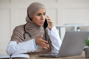 Middle Eastern female doctor wearing hijab and stethoscope around her neck talking on mobile phone and looking at laptop screen while sitting at table in clinic