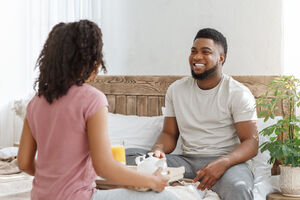 Smiling Black husband and wife talking to each other having breakfast together while sitting on bed at home