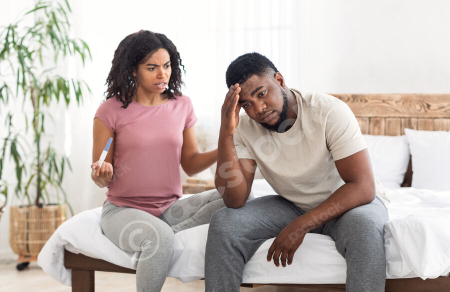 Black girl with positive pregnancy test yelling at her upset boyfriend, bedroom interior