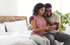 Smiling Black husband and wife using smartphone together while lying on bed at home