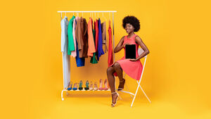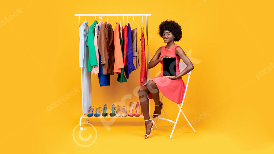 Black woman with afro showing tablet with empty screen while sitting on chair near clothes rack against yellow background in studio