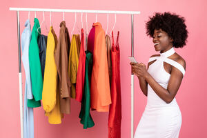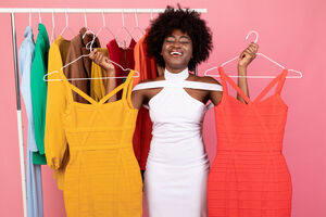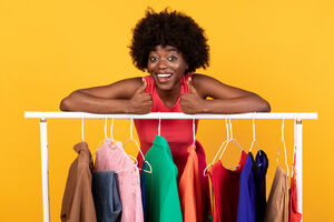 Black woman with afro touching face holding dress on hanger standing near clothes rack against yellow background in studio