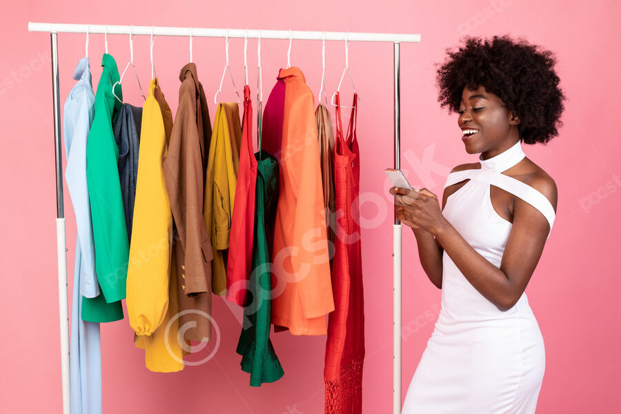 Black woman with afro holding dresses on hangers while standing near clothes rack against pink background in studio