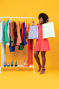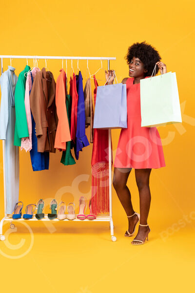 Black woman with afro holding shopping bags while standing near clothes rack against yellow background in studio