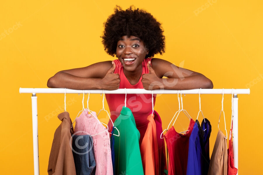 Black woman with afro showing thumbs up leaning on clothes rack while standing against yellow background in studio
