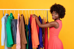 Black woman choosing clothes from rack while standing against yellow background in studio