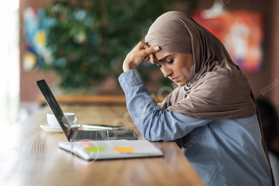 Black woman having headache during training at public park, sitting on stairs, rubbing her head, copy space
