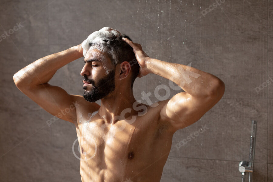 Middle Eastern man applying shampoo on hair while taking shower in bathroom at home