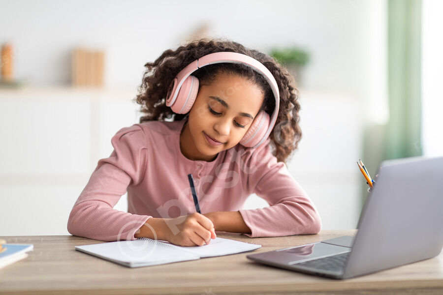 Cheerful Asian boy student with eyeglasses looking away while sitting at table with laptop, notebook, and pencils living room at home