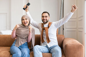 Arab Muslim woman in hijab and caucasian husband raising their fists celebrating victory while sitting on sofa and watching sports game on TV at home